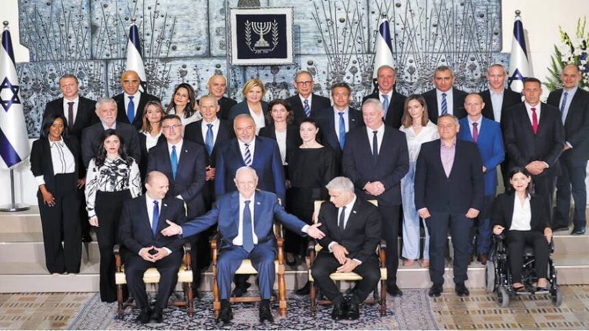 Photo: Η νέα κυβέρνηση του Ισραήλ. Εκτός από τους υπουργούς, ξεχωρίζουν (στην πρώτη σειρά, καθήμενοι) από αριστερά: ο πρωθυπουργός Ναφτάλι Μπένετ, ο πρόεδρος της χώρας Ρούβεν Ρίβλιν και ο κυβερνητικός εταίρος (θα αναλάβει την πρωθυπουργία σε δύο χρόνια) και υπουργός Εξωτερικών Γιαΐρ Λαπίντ. Φωτ. EPA / ATEF SAFADI
