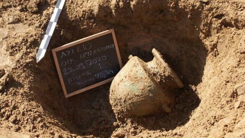 «Από την πρώτη εκτίμηση των κτερισμάτων του, ο ταφικός πίθος χρονολογείται στα τέλη του 4ου με αρχές του 3ου αι. π.Χ. Πέρα από το μεγάλο αριθμό των αγγείων της ελληνιστικής εποχής κυρίως, από τα ευρήματα των υπόλοιπων τάφων ξεχωρίζει μαρμάρινη επιτύμβια στήλη με αετωματική επίστεψη», καταλήγει η ανακοίνωση του ΥΠΠΟΑ.