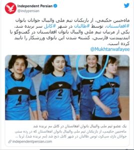 Η Μαχτζαμπίν Χακίμι ήταν από τις κορυφαίες αθλήτριες βόλεϊ της χώρας. Δολοφονήθηκε πριν από λίγες ημέρες αλλά η οικογένειά της απειλήθηκε και αναγκάστηκε να το αποσιωπήσει. Ο φόνος έγινε γνωστός όταν σε χώρο κοινωνικής δικτύωσης δημοσιεύτηκε φωτογραφία της κοπέλας με κομμένο το κεφάλι. Πριν από λίγους μήνες είχε πυροβοληθεί η βολεϊμπολίστρα Ζάχρα Γκαγιάζι. Την περασμένη εβδομάδα, η FIFA και η κυβέρνηση του Κατάρ φυγάδευσαν από το Αφγανιστάν πολλές αθλήτριες του ποδοσφαίρου και μέλη των οικογενειών τους.