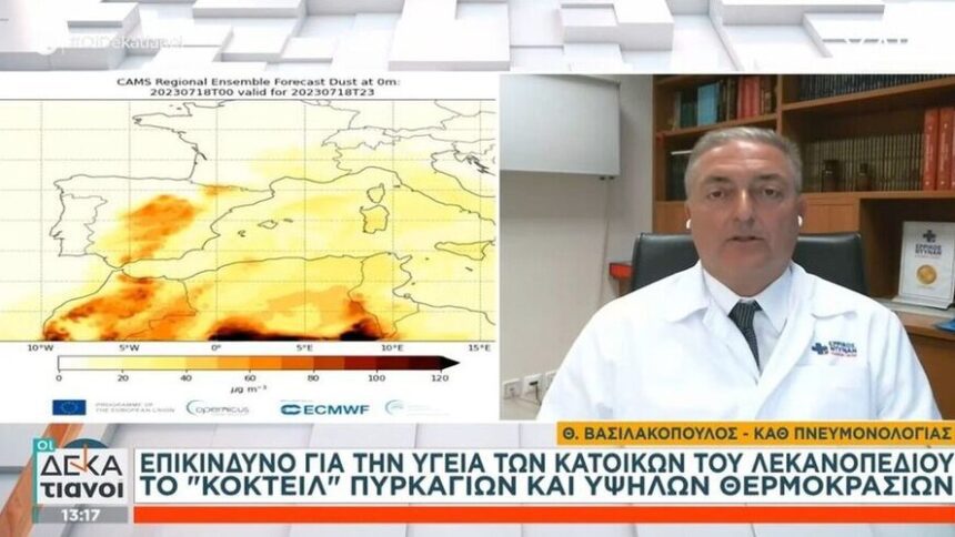 Ο Καθηγητής Πνευμονολογίας, Θεόδωρος Βασιλακόπουλος, μίλησε στο ΣΚΑΪ για το πόσο επικίνδυνο μπορεί να είναι για την υγεία των κατοίκων του λεκανοπεδίου, το «κοκτέιλ» πυρκαγιών και υψηλών θερμοκρασιών.