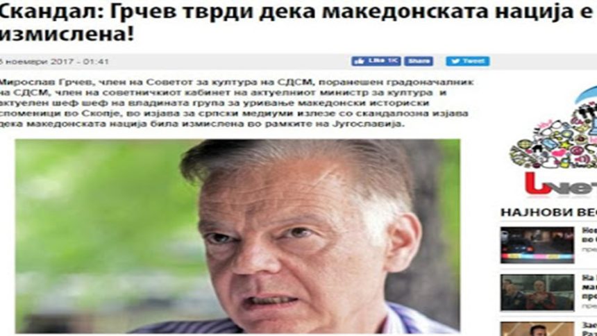 Ο Μίροσλαβ Γκάρτσεφ, μέλος του Συμβουλίου Πολιτισμού του Σοσιαλδημοκρατικού Κόμματος – SDSM, πρώην δήμαρχος του SDSM, μέλος του υπουργικού συμβουλίου του σημερινού Υπουργείου Πολιτισμού και σημερινός επικεφαλής της κυβερνητικής ομάδας για την καταστροφή των ‘μακεδονικών’ ιστορικών μνημείων στα Σκόπια, σε δήλωσή του προς τα σερβικά μέσα ενημέρωσης κατέληξε σε μια σκανδαλώδη αναφορά λέγοντας ότι το ‘μακεδονικό έθνος’ είναι ένα εφεύρημα της Γιουγκοσλαβίας, γράφει η ‘Βέτσερ’ και συνεχίζει: