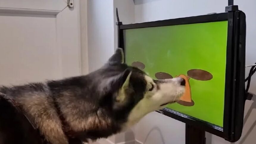 Ο σκύλος μαθαίνει να ακουμπά τη μουσούδα του σε μια οθόνη αφής και στη συνέχεια εκπαιδεύεται να παίζει τα διάφορα παιχνίδια.