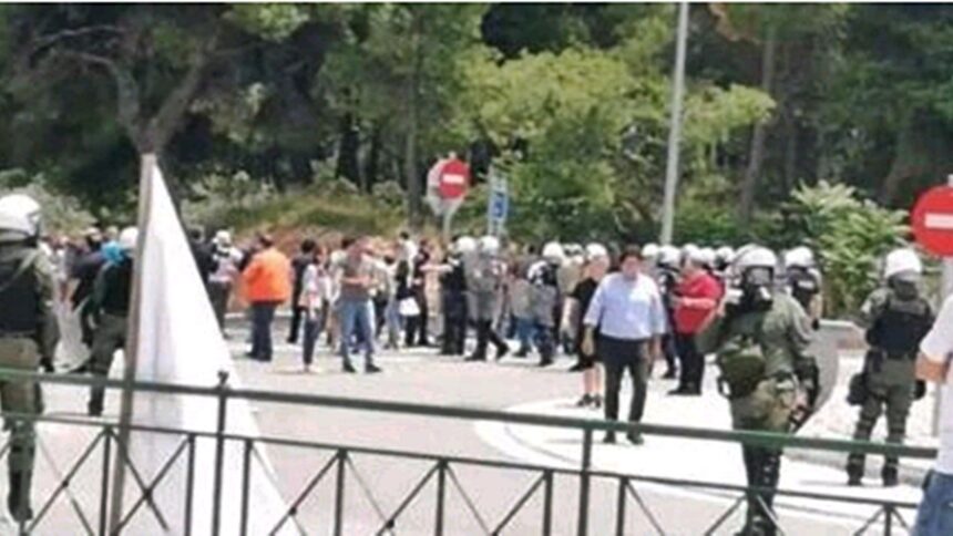 Οι αστυνομικές δυνάμεις δημιούργησαν φραγμό στο σημείο, προκειμένου να τους αποτρέψουν να αποκλείσουν την Εθνική Οδό. Δέχθηκαν επανειλημμένες επιθέσεις από τους συγκεντρωμένους, που χρησιμοποίησαν σωματική βία, πέτρες και ξύλα στην προσπάθειά τους να τις διασπάσουν. Στη συνέχεια οι συγκεντρωμένοι χωρίστηκαν σε μικρότερες ομάδες και αφού ξήλωσαν το συρματόπλεγμα του παράδρομου προς τον κόμβο Μαρκοπούλου, εξήντα (60) περίπου εξ αυτών εισήλθαν στην Εθνική Οδό. Οι αστυνομικές δυνάμεις, αν και εδέχθησαν εκ νέου επιθέσεις με πέτρες, τους απομάκρυναν από το σημείο.