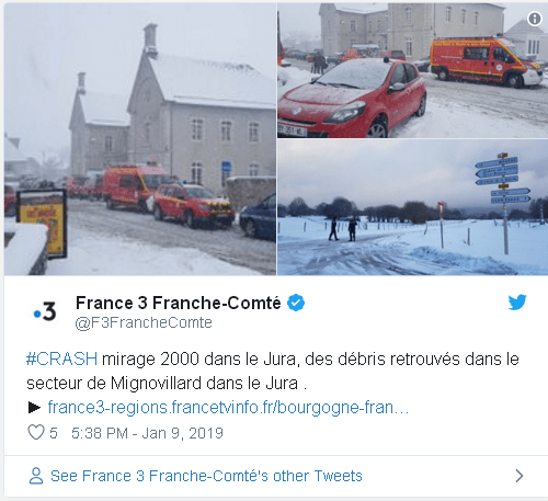 Το μαχητικό που είχε απογειωθεί από την αεροπορική βάση του Νανσί-Οσέ, εξαφανίστηκε από τις οθόνες των ραντάρ το μεσημέρι της Τετάρτης, σε μια ορεινή περιοχή, ανάμεσα στο Ντουμπ και τον Ιούρα, όπως έγινε γνωστό από την περιφέρεια του Ντουμπ.