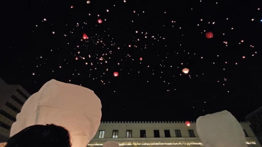Εκατοντάδες χάρτινα φαναράκια πέταξαν στην Πλατεία Κοτζιά, δίνοντας φως και λάμψη στον ουρανό της Αθήνας και προσφέροντας ένα όμορφο θέαμα σε όσους βρέθηκαν εκεί.