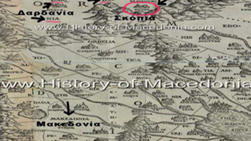 | Photo:Σπάνιος χάρτης που εκδόθηκε στη Βιέννη το 1545, από τον Νικόλαο Σοφιανό, Έλληνα Κερκυραίο, ιερέα, γλωσσολόγο, μεταφραστή, και εκδότη. Στο επάνω μέρος η πόλη των Σκοπίων (Scupi) βρίσκεται στη Δαρδανία. Είναι χαρακτηριστικό πόσο νοτιότερα βρίσκεται η Μακεδονία-Ελλάδα. |