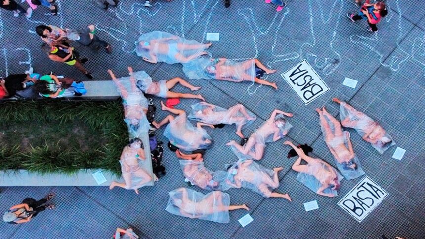Photo:Διαμαρτυρία γυναικών καλυμμένων με πλαστικές σακούλες στο Μπουένος Αϊρες, για τη νομοθετική αδιαφορία κατά της βίας. Στην Ελλάδα, σύμφωνα με στοιχεία της ΕΛ.ΑΣ., το πρώτο εννεάμηνο του 2021 είχαν καταγραφεί 5.857 περιστατικά. Φωτ. A.P. Photo / Natacha Pisarenko.