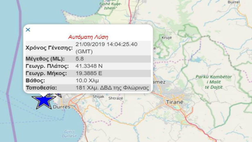 Ισχυρή σεισμική δόνηση έπληξε το απόγευμα του Σάββατου την Αλβανία. Ο σεισμός, μεγέθους 5,8 Ρίχτερ, καταγράφηκε στις 17:04 (ώρα Ελλάδος) και είχε επίκεντρο στον θαλάσσιο χώρο της Αδριατικής, 34 χιλιόμετρα δυτικά των Τιράνων.