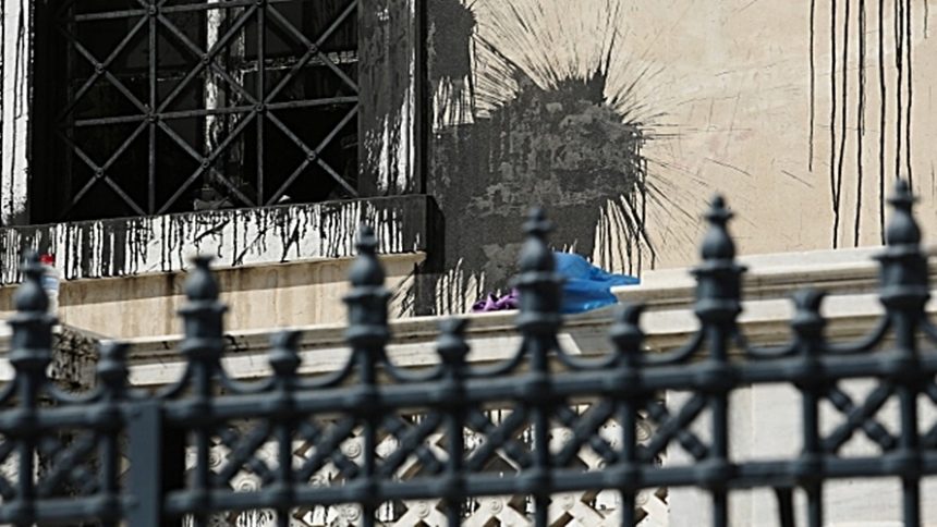 Τα μέλη της ομάδας πέταξαν για άλλη μια φορά ανενόχλητοι στην «καρδιά» της Αθήνας μαύρη μπογιά τόσο στην είσοδο όσο και στην πρόσοψη του κτιρίου. Η ομάδα των κουκουλοφόρων μάλιστα έφτασε μέχρι την είσοδο καταστρέφοντας το μηχάνημα ανίχνευσης μεταλλικών αντικειμένων χωρίς ωστόσο να εισβάλουν στους εσωτερικούς χώρους.