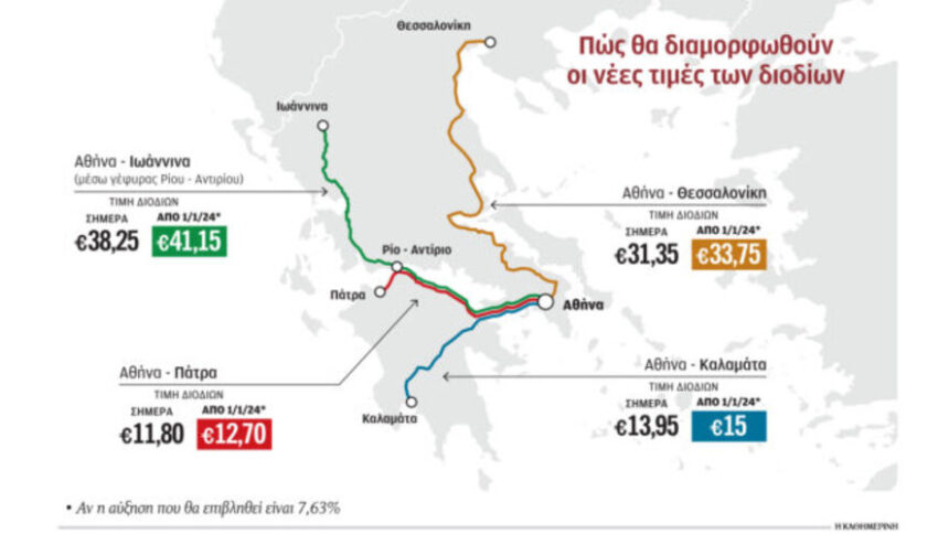 Σύμφωνα με πληροφορίες της «Κ», πριν από λίγες ημέρες οι δύο πλευρές οδηγήθηκαν σε συμφωνία και έτσι οι παραχωρησιούχοι πρόκειται μέσα στις επόμενες ημέρες να ενημερώσουν και τυπικά το υπουργείο Υποδομών (όπως οφείλουν από τις συμβάσεις παραχώρησης) για το ύψος της αύξησης που θα επιβληθεί από την 1η Ιανουαρίου 2024.
