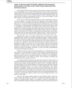 «Σας γράφω σε απάντηση των επιστολών της 18ης Σεπτεμβρίου και της 6ης Οκτωβρίου 2020 που σας απηύθυνε ο Ελληνοκύπριος εκπρόσωπος στη Νέα Υόρκη και κυκλοφόρησαν ως έγγραφα της Γενικής Συνέλευσης και του Συμβουλίου Ασφαλείας (A/75/243-S/2020/926 και A/75/499-S/2020/985), οι οποίες, για άλλη μια φορά, στρεβλώνουν την πραγματικότητα. Για να ξεκαθαρίσω τα πράγματα, θα ήθελα να επιστήσω την προσοχή σας στα ακόλουθα. Κατ’ αρχάς, πρέπει να τονιστεί ότι κανένα από τα ψηφίσματα του Συμβουλίου Ασφαλείας των Ηνωμένων Εθνών για την Κύπρο δεν χαρακτηρίζει ως «εισβολή» τη νόμιμη και δικαιολογημένη τουρκική επέμβαση του 1974, η οποία πραγματοποιήθηκε σύμφωνα με το άρθρο 4 της Συνθήκης Εγγυήσεων του 1960 η την διατήρηση της παρούσας των τουρκικών δυνάμεων στο νησί σαν «κατοχή» Τέτοιοι ισχυρισμοί δεν είναι παρά καθαρά ελληνοκυπριακή πλαστογραφία με στόχο τη στρέβλωση των ιστορικών γεγονότων και των πραγματικοτήτων του νησιού. Στο πλαίσιο αυτό, είναι επιτακτική ανάγκη να υπενθυμίσουμε τη δραματική δήλωση που έκανε ενώπιον του Συμβουλίου Ασφαλείας στις 19 Ιουλίου 1974 ο Αρχιεπίσκοπος Μακάριος, Ελληνοκύπριος ηγέτης της εποχής, στην οποία κατηγόρησε ανοιχτά την Ελλάδα, όχι την Τουρκία, για εισβολή και κατοχή της Κύπρου. Τα σχόλιά του, τα οποία πραγματοποιήθηκαν μόλις τέσσερις ημέρες μετά το ελληνοκυπριακό πραξικόπημα της 15ης Ιουλίου 1974, καταγράφονται καλά στα αρχεία των Ηνωμένων Εθνών και δεν απαιτούν περαιτέρω επεξεργασία….».