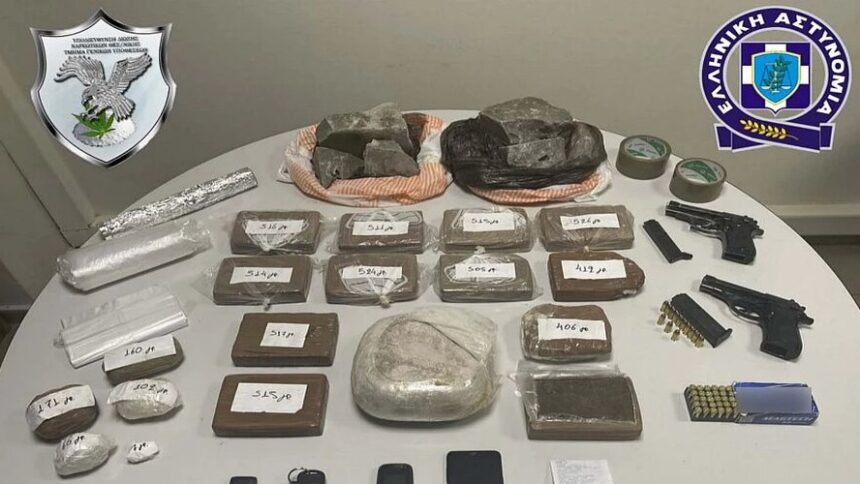 Στη συγκεκριμένη αστυνομική επιχείρηση, πραγματοποιήθηκαν έρευνες σε υπαίθριους χώρους και σε διαμερίσματα που χρησιμοποιούσαν σε περιοχές του Νομού Αττικής αλλά και σε δύο επιβατικά οχήματα που χρησιμοποιούσαν για τις μετακινήσεις τους και τη μεταφορά των ναρκωτικών, κατά τις οποίες βρέθηκαν και κατασχέθηκαν συνολικά σχεδόν 9 κιλά ηρωινής, μικροποσότητα κοκαΐνης, δενδρύλλια και ποσότητα κάνναβης, δύο πιστόλια, φυσίγγια κ.ά.