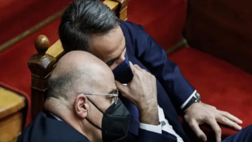 Ο Κυριάκος Μητσοτάκης συνομιλεί με τον Νίκο Δένδια στη Βουλή.Το θετικό για την Ελλάδα προσχέδιο συμπερασμάτων της Συνόδου Κορυφής της ΕΕ, με την αυστηρή αναφορά για την προκλητική στάση της Τουρκίας, η οποία αναμένεται να επαναληφθεί και στα τελικά συμπεράσματα, δεν προέκυψε συγκυριακά.