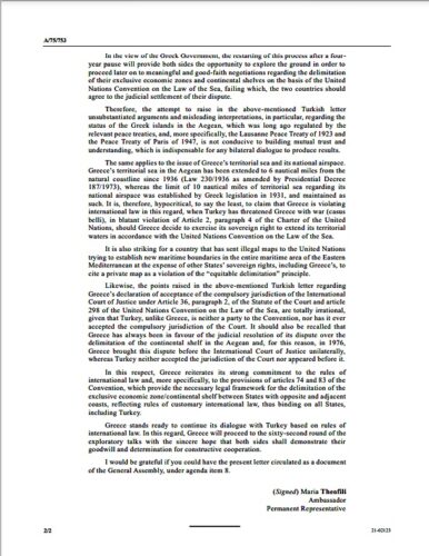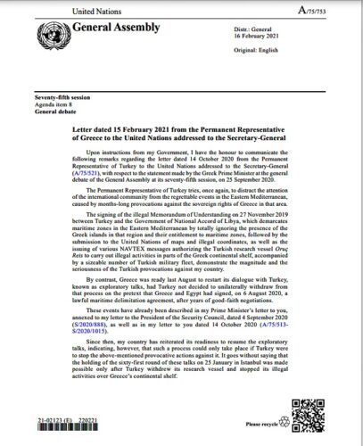 Η Ελληνίδα Μόνιμη Αντιπρόσωπος Μ. Θεοφίλη στην επιστολή της με ημερομηνία 15 Φεβρουαρίου (A/75/753) επισημαίνει ότι όσα αναφέρονται στην τουρκική επιστολή αποτελούν προσπάθεια απόσπασης της προσοχής από τις τουρκικές προκλήσεις και τις παραβιάσεις κυριαρχικών δικαιωμάτων της χώρας μας και γίνεται ειδική αναφορά στην αποχώρηση της Τουρκίας πέρυσι το καλοκαίρι από την προγραμματισμένη συνάντηση για τις διερευνητικές, με επίκληση της συμφωνίας Ελλάδας – Αιγύπτου που όμως έγινε στην βάση του Διεθνούς Δικαίου.
