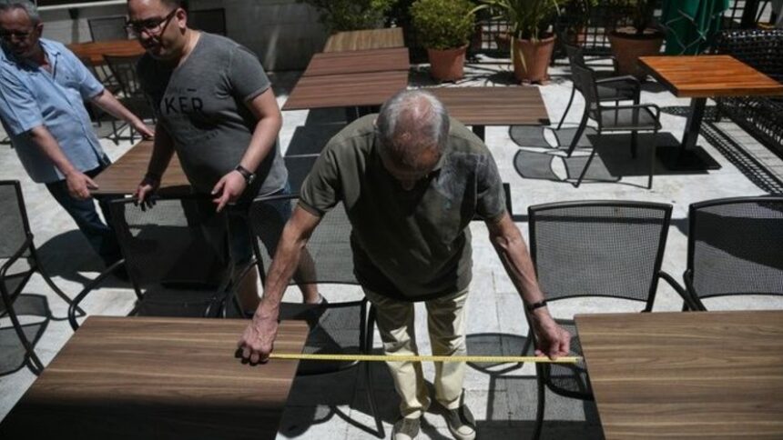 Στο κέντρο της Αθήνας κυριαρχεί τις τελευταίες μέρες, ο ήχος από τα ηλεκτρικά τρυπάνια ενώ οι σκάλες και οι μεζούρες συνθέτουν το σκηνικό που επικρατεί έξω από τα καταστήματα εστίασης. Στην Κολοκοτρώνη, στη Μητροπόλεως, στην Πλάκα, στο Ψυρρή, όπου υπάρχουν εστιατόρια, καφέ και μπαρ έχουν τοποθετηθεί ταινίες σήμανσης που καθορίζουν το χώρο όπου θα καταλάβει κάθε μαγαζί ενώ ήδη κάποια καταστήματα έχουν τοποθετήσει τραπεζοκαθίσματα των 2, 4 και 6 ατόμων, τηρώντας πάντα την προβλεπόμενη απόσταση, η οποία σύμφωνα με την διάταξη των καθισμάτων, θα πρέπει να είναι από 0,70 εκατ. έως 1,70 εκατ. Σημειώνεται ότι ο μέγιστος επιτρεπόμενος αριθμός καθήμενων σε τραπέζι θα είναι τα έξι άτομα.