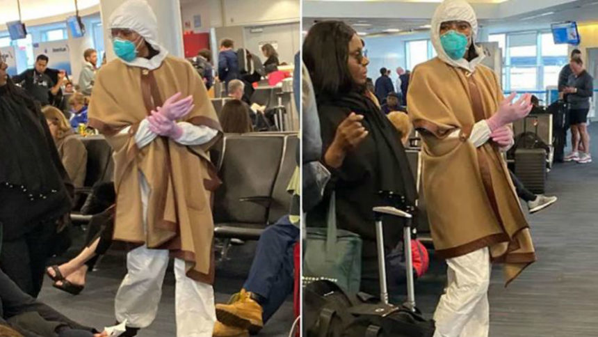 Τώρα και ενόψει του κορωνοϊού, η διάσημη καλλονή επιλέγει να ταξιδέψει με εμφάνιση που περιλαμβάνει ολόσωμη στολή προστασίας, μάσκα και γάντια.