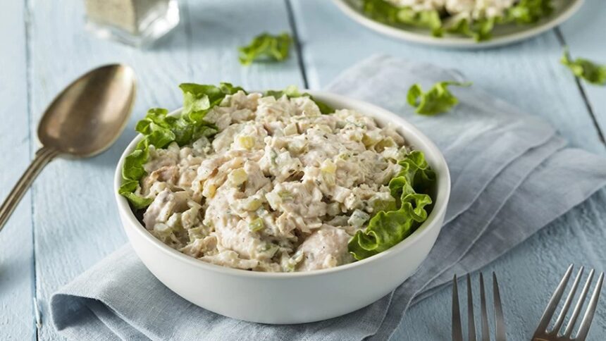 Προσθέστε το κοτόπουλο, τα καβουρδισμένα αμύγδαλα και το σέλινο και ανακατέψτε καλά.