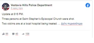 «Τρεις άνθρωποι στην επισκοπική εκκλησία του Αγίου Στεφάνου χτυπήθηκαν από σφαίρες. Δύο θύματα διακομίστηκαν σε τοπικό νοσοκομείο και δέχονται ιατρική περίθαλψη. Δυστυχώς, ένα από τα θύματα υπέκυψε στα τραύματά του», ανέφερε η αστυνομία μέσω Facebook.
