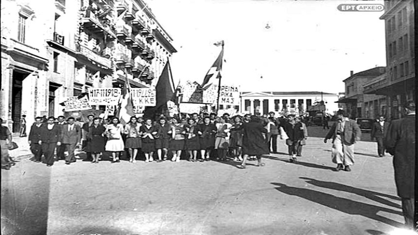 Μέλη του ΚΚΕ στην οδό Κοραή με σημαίες, πανό και χωνιά, Οκτώβριος 1944. Αρχείο ΕΡΤ/Συλλογή Π.Πουλίδη