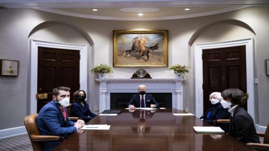 Photo: Ο πρόεδρος Τζο Μπάιντεν συνομιλεί με την υπουργό Οικονομικών Τζάνετ Γέλλεν (2-Δ), και την αντιπρόεδρο Καμάλα Χάρις (2-Α) στο Λευκό Οίκο. EPA, Al Drago / POOL