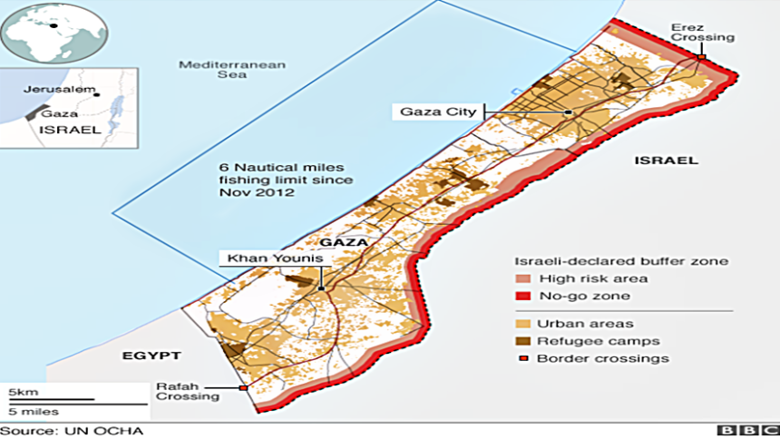 Πατρίδα για περίπου 1,9 εκατομμύρια ανθρώπους, η Γάζα έχει μήκος μόλις 41 χλμ και πλάτος δέκα χλμ. Ένας θύλακας που περιβάλλεται από την Μεσόγειο και συνορεύει με το Ισραήλ και την Αίγυπτο.