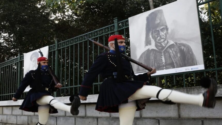 Photo: Εύζωνες της Προεδρικής Φρουράς περνούν μπροστά από την υπαίθρια έκθεση προσωπογραφιών ηρώων της επανάστασης του 1821, που φιλοξενείται στην περίφραξη του Εθνικού Κήπου, η οποία διοργανώθηκε από το Ίδρυμα Σύλβιας Ιωάννου, το Εθνικό Ιστορικό Μουσείο και τον Δήμο Αθηναίων, στο πλαίσιο των εορτασμών για τα 200 χρόνια από την Ελληνική Επανάσταση, Τρίτη 9 Φεβρουαρίου 2021. ΑΠΕ-ΜΠΕ, ΑΛΕΞΑΝΔΡΟΣ ΒΛΑΧΟΣ
