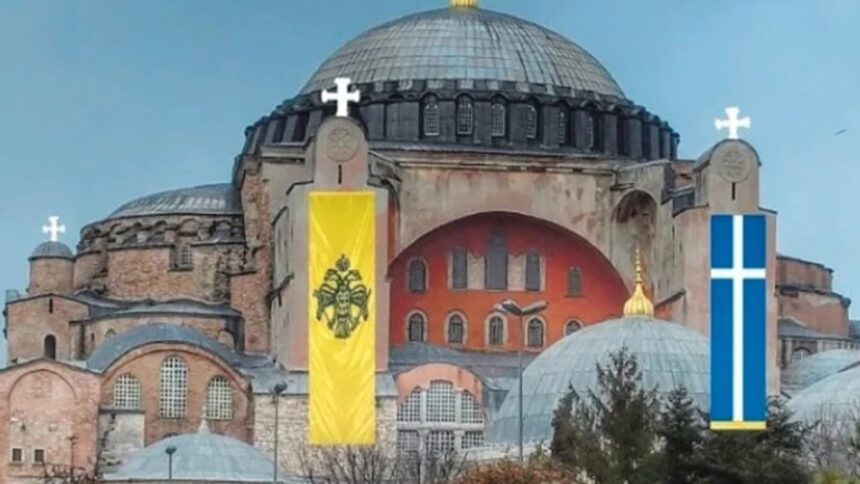 Η νέα αυτή ιδεολογική κατεύθυνση του ελληνικού κράτους απεμπόλησης του δικαιώματος ηγεμονίας επί της ανατολικής Μεσογείου αποδεικνύεται και από την μη υιοθέτηση του αυτοκρατορικού συμβόλου του δικέφαλου αετού στην ελληνική σημαία, την μη επιλογή του αυτοκρατορικού πορφυρού χρώματος σε αυτήν και από την παρανοϊκή και ανιστόρητη πρόσφατη αλλαγή της σημαίας που έφερε αποκλειστικά έναν σταυρό όπως πολλά βυζαντινά λάβαρα σε μια σημαία με ρίγες κατά τα πρότυπα της αμερικανικής σημαίας.