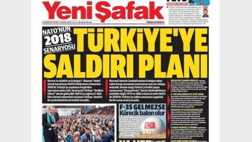 Η εφημερίδα Yeni Şafak, κανονική “ντουντούκα” του Τούρκου Προέδρου Ρετζέπ Ταγίπ Ερντογάν , έγραψε στο πρωτοσέλιδό της ότι το ΝΑΤΟ σχεδιάζει να επιτεθεί στην Τουρκία το 2018! Θα μπορούσε να ΄ναι και ευθυμογράφημα.