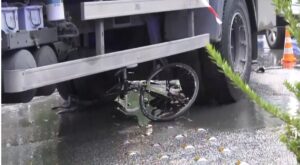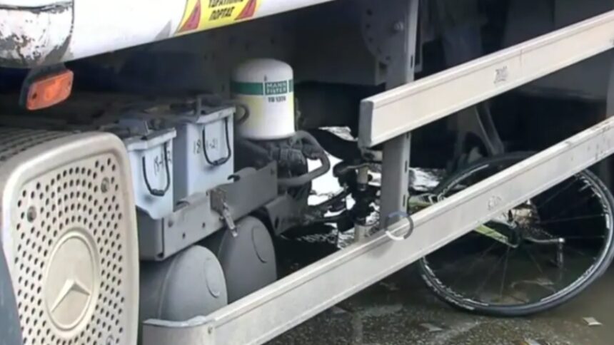 Σοκαριστικές είναι οι εικόνες από το σημείο με το ποδήλατο να έχει συνθλιβεί κάτω από τις ρόδες του φορτηγού.