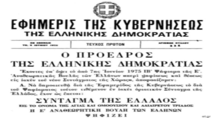 Τον Ιούνιο του 1975 το νέο Σύνταγµα της Ελλάδος αποτέλεσε την ηχηρή εκείνη εντολή του τότε ελληνικού κοινοβουλίου για την επίσηµη αποκατάσταση της Γ’ Ελληνικής ∆ηµοκρατίας. Ύστερα από την ανατροπή των χουντικών κυβερνήσεων, τον ∆εκέµβριο του 1974 διευθετείται µε δηµοψήφισµα το πολιτειακό ζήτηµα της χώρας και η προεδρευόµενη κοινοβουλευτική δηµοκρατία ανακοινώνεται ως το επίσηµο πολίτευµα. Ανοίγει έτσι ο δρόµος για την θέσπιση του νέου Συντάγµατος που θα κατοχύρωνε το νέο πολίτευµα αλλά θα προάσπιζε εκ νέου ατοµικά, κοινωνικά δικαιώµατα και θα αναγνώριζε το διεθνές δίκαιο ως ανώτερο κώδικα νόµων και κανόνων.