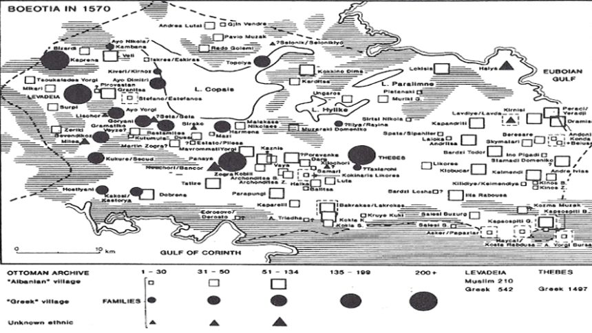 | Ελληνο-αρβανίτικα χωριά, επί οθωμνοκρατίας στην Βοιωτία. Από χάρτη του 1570 (Greek-Arvanitic villages religions Ottoman Voeotia, map 1570). |