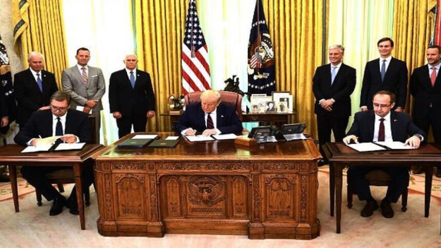 Μια ιστορική συμφωνία υπογράφτηκε την Παρασκευή στο Γραφείο του Λευκού Οίκου ανάμεσα στην ηγεσία της Σερβίας, τον Αλεξάνταρ Βούτσιτς, και της ηγεσίας του Κοσσυφοπεδίου, τον πρωθυπουργό Αμπντουλάχ Χότι, την οποία χαρακτήρισε και ο Πρόεδρος των Ηνωμένων Πολιτειών κ. Ντόναλτ Τραμπ ως «πραγματικά ιστορική δέσμευση». Η συμφωνία για την οικονομική συνεργασία των δύο χωρών εκτός από τις εμπορικές συναλλαγές αναφέρεται στους λατρευτικούς χώρους της Σερβικής Ορθόδοξης Εκκλησίας.