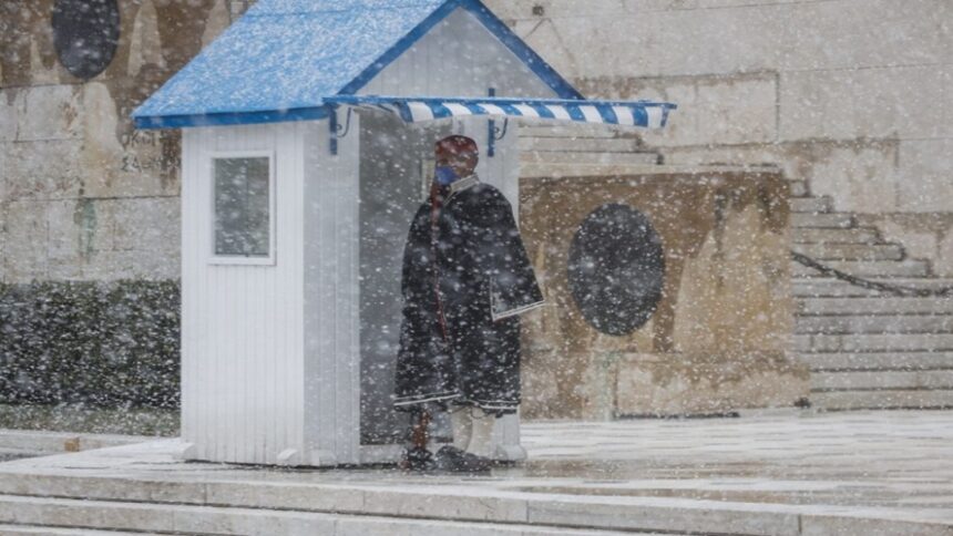 Κακοκαιρία «Ελπίδα»: Τα χιόνια έφτασαν μέχρι το κέντρο της Αθήνας και οι εύζωνες στο Μνημείο του Άγνωστου Στρατιώτη φόρεσαν τις μπλε σκούρες τσόχινες κάπες τους εξαιτίας των χαμηλών θερμοκρασιών.