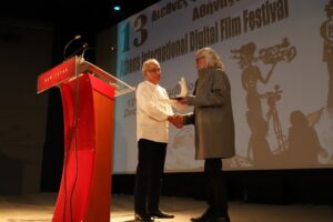 Η βραδιά ξεκίνησε με δύο εξαιρετικές βιντεοπροβολές, σε επιμέλεια του Θανάση Πάνου, αφιερωμένες στους δύο κορυφαίους δημιουργούς του ελληνικού κινηματογράφου: τον Βασίλη Γεωργιάδη και τον Δήμο Θέο, των οποίων το όνομα έχει χαραχτεί ανεξίτηλα στην ιστορία της έβδομης τέχνης. Σε μια συγκινητική στιγμή, η Ερατώ Γεωργιάδη, κόρη του Βασίλη Γεωργιάδη, παρέλαβε το βραβείο για τον πατέρα της, ενώ ο Γιάννης Θέος, αδελφός και στενός συνεργάτης του Δήμου Θέου, παρέλαβε το βραβείο για τον αείμνηστο δημιουργό, ο οποίος είχε υπάρξει δάσκαλος πολλών εκ των διοργανωτών του φεστιβάλ. Τις δύο βραβεύσεις παρέδωσε ο σκηνοθέτης και πρόεδρος του Οργανισμού Συλλογικής Διαχείρισης Δικαιωμάτων Παραγωγών Κινηματογραφικών Έργων “Ερμείας”, Βασίλης Βαφέας ο οποίος μίλησε για αξέχαστες στιγμές του ελληνικού κινηματογράφου και τόνισε τη σπουδαιότητα της ύπαρξης φεστιβάλ, όπως το AIDFF, που στηρίζουν την ανεξάρτητη παραγωγή.