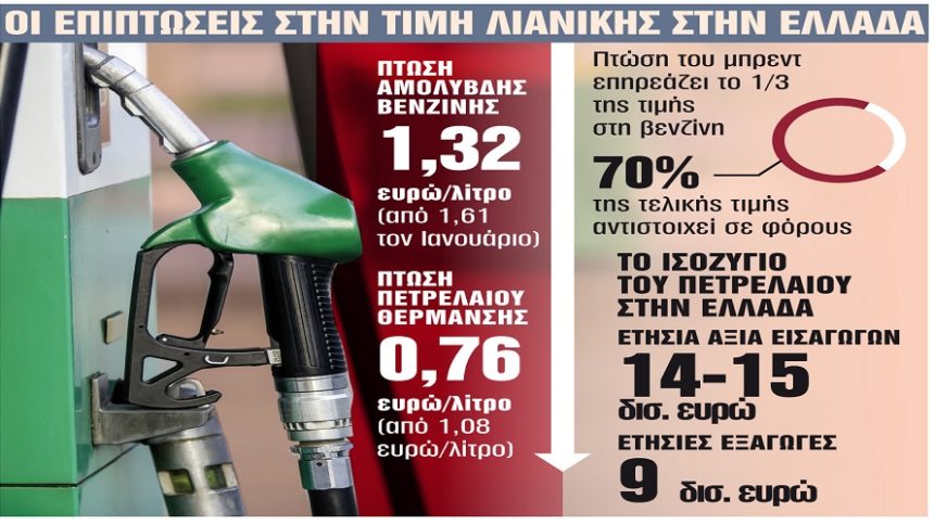 Σύμφωνα με παράγοντες της αγοράς, το κραχ στο πετρέλαιο θα οδηγήσει σε περαιτέρω πτώση των τιμών της αντλίας. Ομως τα αποτελέσματα θα μπορούσε να είναι δραστικότερα αν το 70% της λιανικής τιμής δεν ήταν φόροι. Για τα διυλιστήρια είναι σημαντική ευκαιρία στην προμήθεια πρώτης ύλης, αν και τα όποια οφέλη εξανεμίζονται από την κατάρρευση της ζήτησης.