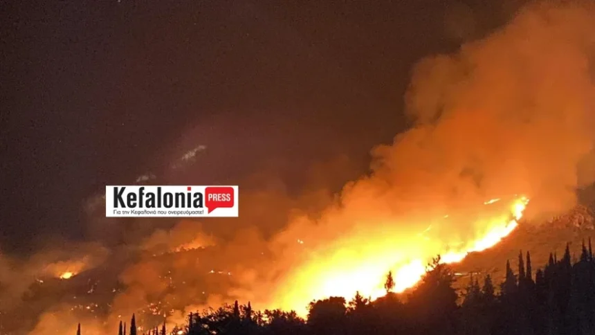 Μαίνεται η μεγάλη φωτιά που ξέσπασε χθες βράδυ στην περιοχή Αγίας Ειρήνης στην Κεφαλονιά, με τις Πυροσβεστικές δυνάμεις να ενισχύονται μέσω Κυλλήνης και Αράξου.