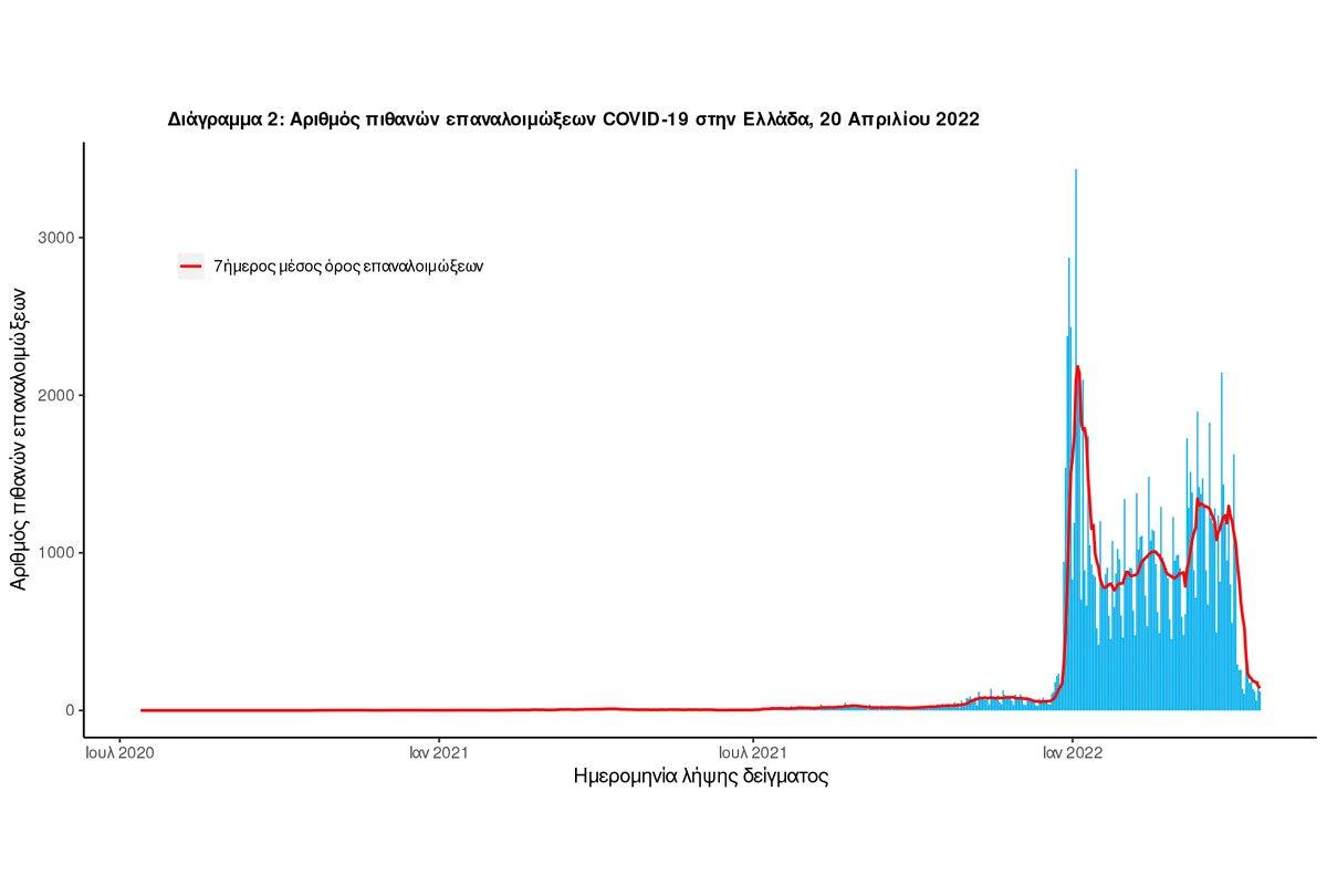 - Ο αριθμός πιθανών νέων επαναλοιμώξεων που καταγράφηκαν τις τελευταίες 24 ώρες ήταν 130 ενώ από την αρχή της πανδημίας SARS-CoV-2 ο συνολικός αριθμός εκτιμάται σε 120.590(3.6% του συνολικού αριθμού των θετικών αποτελεσμάτων).