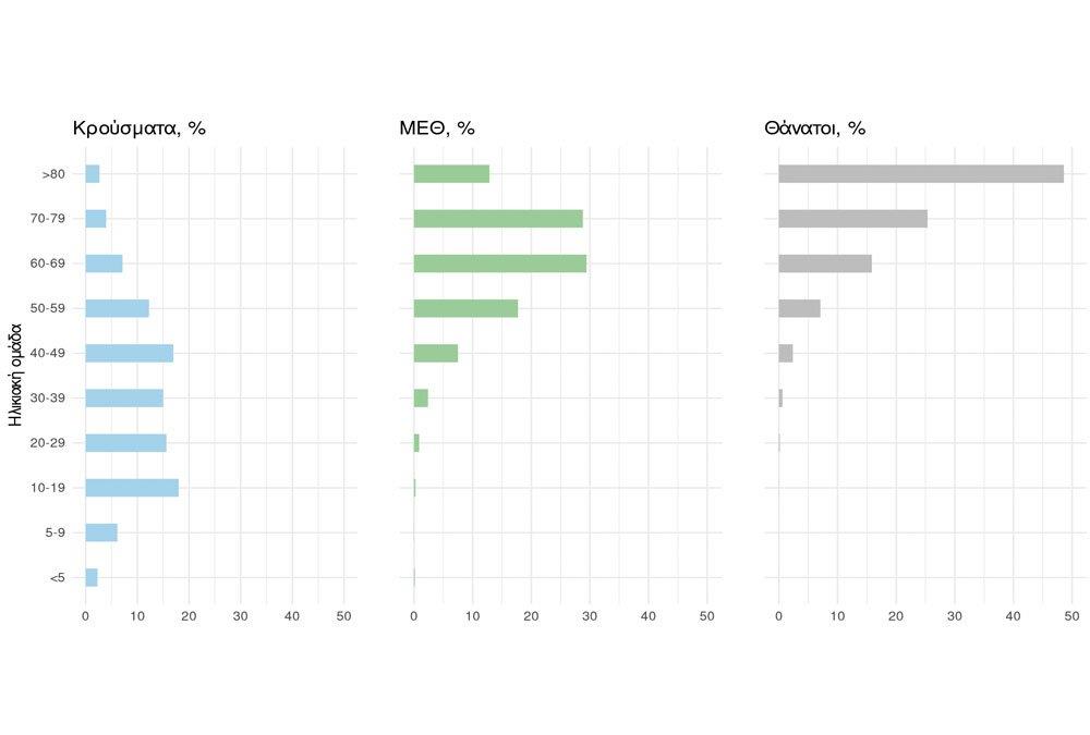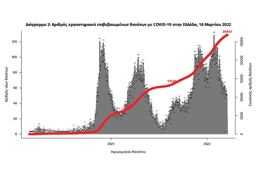 - Οι νέοι θάνατοι ασθενών με COVID-19 είναι 55, ενώ από την έναρξη της επιδημίας έχουν καταγραφεί συνολικά 26.847 θάνατοι. Το 95.2% είχε υποκείμενο νόσημα ή/και ηλικία 70 ετών και άνω. Ο αριθμός των ασθενών που νοσηλεύονται διασωληνωμένοι είναι 354 (63.3% άνδρες). Η διάμεση ηλικία τους είναι 69 έτη. To 90.4% έχει υποκείμενο νόσημα ή/και ηλικία 70 ετών και άνω. Μεταξύ των ασθενών που νοσηλεύονται διασωληνωμένοι, 228 (64.41%) είναι ανεμβολίαστοι ή μερικώς εμβολιασμένοι και 126 (35.59%) είναι πλήρως εμβολιασμένοι. Από την αρχή της πανδημίας έχουν εξέλθει από τις ΜΕΘ 4.384 ασθενείς.