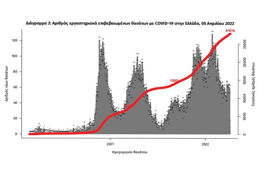 - Οι νέοι θάνατοι ασθενών με COVID-19 είναι 70, ενώ από την έναρξη της επιδημίας έχουν καταγραφεί συνολικά 27.816 θάνατοι. Το 95.4% είχε υποκείμενο νόσημα ή/και ηλικία 70 ετών και άνω.