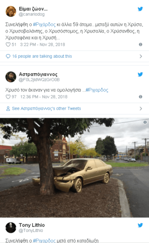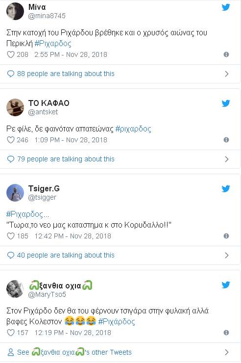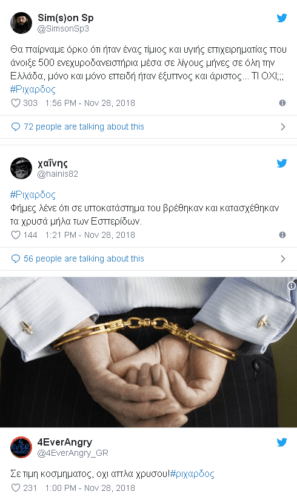 Δεν πρόλαβαν να περάσουν χειροπέδες στον «εθνικό ενεχυροδανειστή» Ριχάρδοοι αστυνομικοί για λαθρεμπορία χρυσού και το Twitter πήρε «φωτιά» και το hashtag #Ριχάρδος έγινε πρώτο trend.