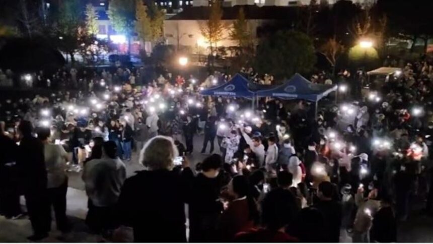 Βίντεο δείχνουν φοιτητές να υψώνουν φύλλα λευκού χαρτιού και να ανάβουν τους φακούς των κινητών τηλεφώνων τους.