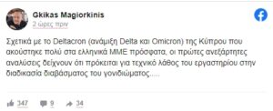 «Σχετικά με το Deltacron (ανάμιξη Delta και Omicron) της Κύπρου που ακούστηκε πολύ στα ελληνικά ΜΜΕ πρόσφατα, οι πρώτες ανεξάρτητες αναλύσεις δείχνουν ότι πρόκειται για τεχνικό λάθος του εργαστηρίου στην διαδικασία διαβάσματος του γονιδιώματος», ανέφερε χαρακτηριστικά ο Γκίκας Μαγιορκίνης.