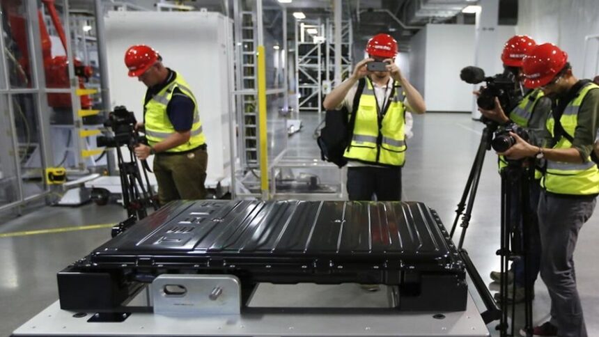 Photo: Μια μπαταρία ιόντων λιθίου που προορίζεται για την τροφοδοσία ενός ηλεκτρικού αυτοκινήτου Tesla – Οι ειδικοί προβλέπουν τον εξαπλασιασμό της παγκόσμιας ζήτησης σε λίθιο έως το 2030.AP Photo / Rich Pedroncelli