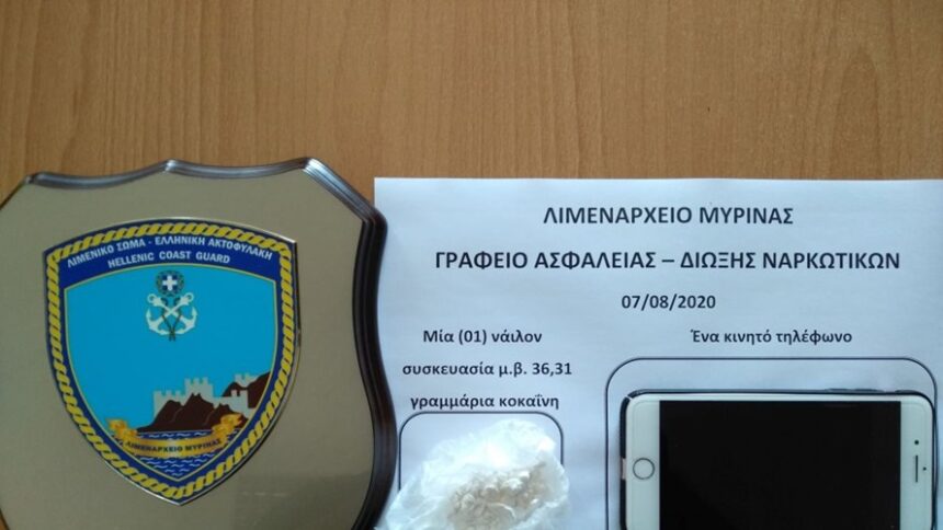 Στην ταξιδιωτική αποσκευή του νεαρού βρέθηκε κρυμμένη μία νάιλον συσκευασία που περιείχε κοκαΐνη βάρους 36,31 γραμμαρίων την οποία σκόπευε να διαθέσει προς πώληση. Έτσι, συνελήφθη και οδηγήθηκε στην Εισαγγελία Μυτιλήνης, ενώ κατασχέθηκε και το κινητό του τηλέφωνο για να εντοπιστούν τυχόν διασυνδέσεις του στη Λήμνο.