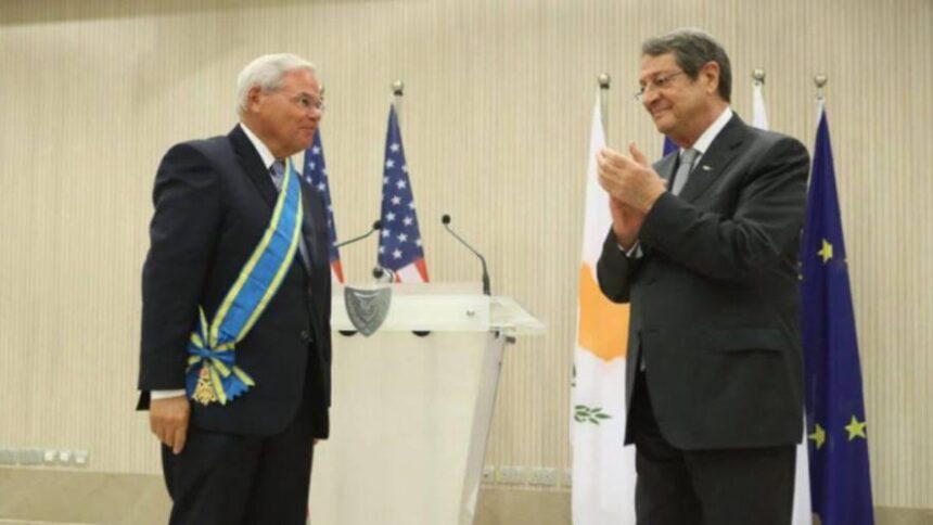 Με το παράσημο του Μεγαλόσταυρου του Τάγματος του Μακαρίου Γ΄ τίμησε τη Δευτέρα το βράδυ ο Πρόεδρος της Δημοκρατίας, Νίκος Αναστασιάδης, τον Αμερικανό Γερουσιαστή και Πρόεδρο της Επιτροπής Εξωτερικών Σχέσεων της Γερουσίας των ΗΠΑ, Ρόμπερτ Μενέντεζ, ο οποίος τόνισε πως στόχος του είναι να δει και τον τελευταίο Τούρκο στρατιώτη να φεύγει από την Κύπρο.