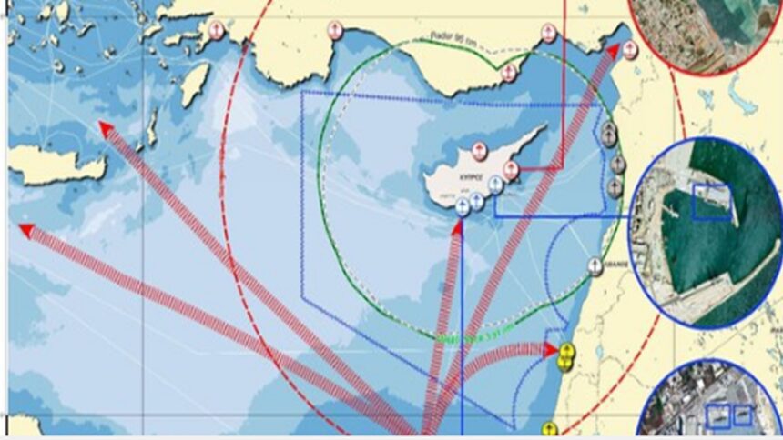 Ο χάρτης αποτυπώνει τις δυνατότητες των ραντάρ της Κυπριακής Δημοκρατίας, καθώς και τις Ναυτικές Βάσεις της ίδιας και γειτονικών κρατών, όπως και εκείνων της Τουρκίας στα κατεχόμενα και εντός του εδάφους της. Ο κόκκινος μεγάλος διακεκομμένος κύκλος δείχνει την ακτίνα του Ραντάρ στο Τρόοδος, με το οποίο εντοπίζονται τα αεροπλάνα στην περιοχή μας. Ο πράσινος κύκλος αφορά στην ακτίνα δράσης, δηλαδή στο βεληνεκές των γαλλικών πυραύλων “Exocet Block 3” (97 ν.μ.), που αναμένεται να αναπτυχθούν εάν όλα κυλήσουν ομαλά κατά το τρέχον έτος. Ο λευκός με μαύρο χρώμα διακεκομμένος κύκλος καταγράφει την ακτίνα των ραντάρ του κυπριακού ναυτικού (96 ν.μ.), που εντοπίζει την κίνηση των πλοίων. Με τα κόκκινα τόξα, που έχουν ως βάση το Σουέζ, απεικονίζονται οι βασικές πορείες των πλοίων στην περιοχή μας και καταδεικνύουν πόσο σημαντική θα είναι για την Κύπρο η κατασκευή μιας Ναυτικής Βάσης, που θα μας προσδώσει σημαντικά γεωστρατηγικά και γεωπολιτικά πλεονεκτήματα, ειδικώς για τις συνεργασίες με γειτονικά κράτη, καθώς και σε επίπεδο ΕΕ στην πρακτική εφαρμογή της Στρατηγικής Πυξίδας.