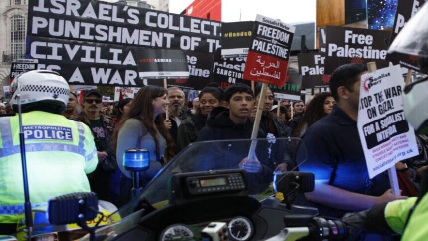 Οι άνθρωποι κρατούσαν ψηλά πλακάτ που έγραφαν «Ελεύθερη Παλαιστίνη», ενώ άλλοι άνοιξαν μια γιγάντια παλαιστινιακή σημαία και άφησαν πράσινες φωτοβολίδες καπνού. Οι διαδηλωτές στην πρωτεύουσα ζήτησαν τον τερματισμό των ισραηλινών αεροπορικών επιδρομών στη Γάζα, στον απόηχο της αιφνιδιαστικής τρομοκρατικής επίθεσης από τη Χαμάς στις 7 Οκτωβρίου.