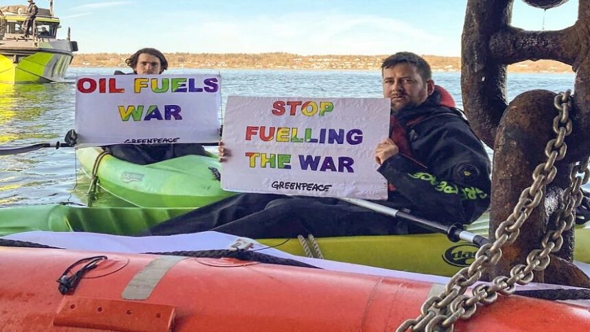 Ακτιβιστές της Greenpeace, που είχαν επιβιβαστεί σε μια σωστική λέμβο, αλυσοδέθηκαν στην άγκυρά του, ενώ άλλοι που βρίσκονταν σε καγιάκ άνοιξαν πανό με το σύνθημα “Oil fuels war” (Το πετρέλαιο τροφοδοτεί τον πόλεμο), σύμφωνα με τη ΜΚΟ.