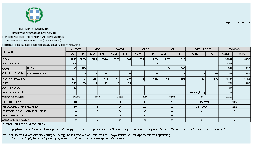 Σύμφωνα με τα επίσημα στοιχεία του υπουργείου Εσωτερικών/Εθνικό Συντονιστικό Κέντρο Ελέγχου Συνόρων, Μετανάστευσης και Ασύλου (Ε.Σ.Κ.Ε.Σ.Μ.Α.) για την αποτύπωση της εικόνας στο προσφυγικό/μεταναστευτικό ζήτημα, χθες στην Ελλάδα παρέμεναν 20.112 πρόσφυγες και μετανάστες, ενώ σήμερα είναι 20.050 μετά τις χθεσινές αναχωρήσεις για την ηπειρωτική χώρα.