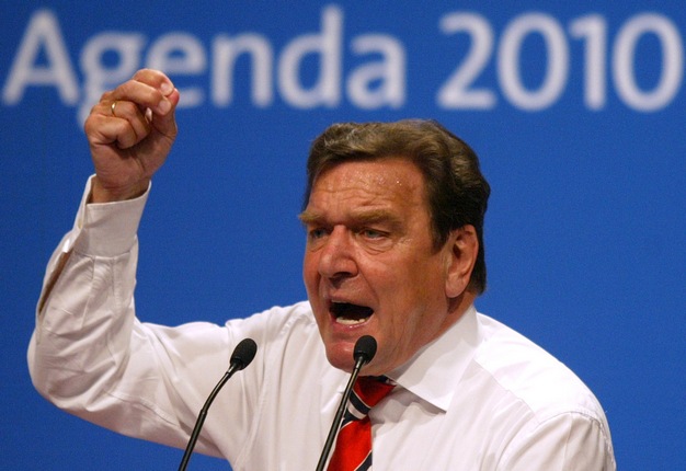 Ο Γερμανός καγκελάριος Γκέρχαρντ Σρέντερ μιλά σε ένα ειδικό συνέδριο του Σοσιαλδημοκρατικού Κόμματος SPD στο Βερολίνο την 1η Ιουνίου 2003 για το λεγόμενο πακέτο μεταρρυθμίσεων της Ατζέντας 2010 που είχε σχεδιαστεί για την μείωση του κόστους κοινωνικής πρόνοιας και την τόνωση της στάσιμης οικονομίας της Γερμανίας. REUTERS / Kai Pfaffenbach
